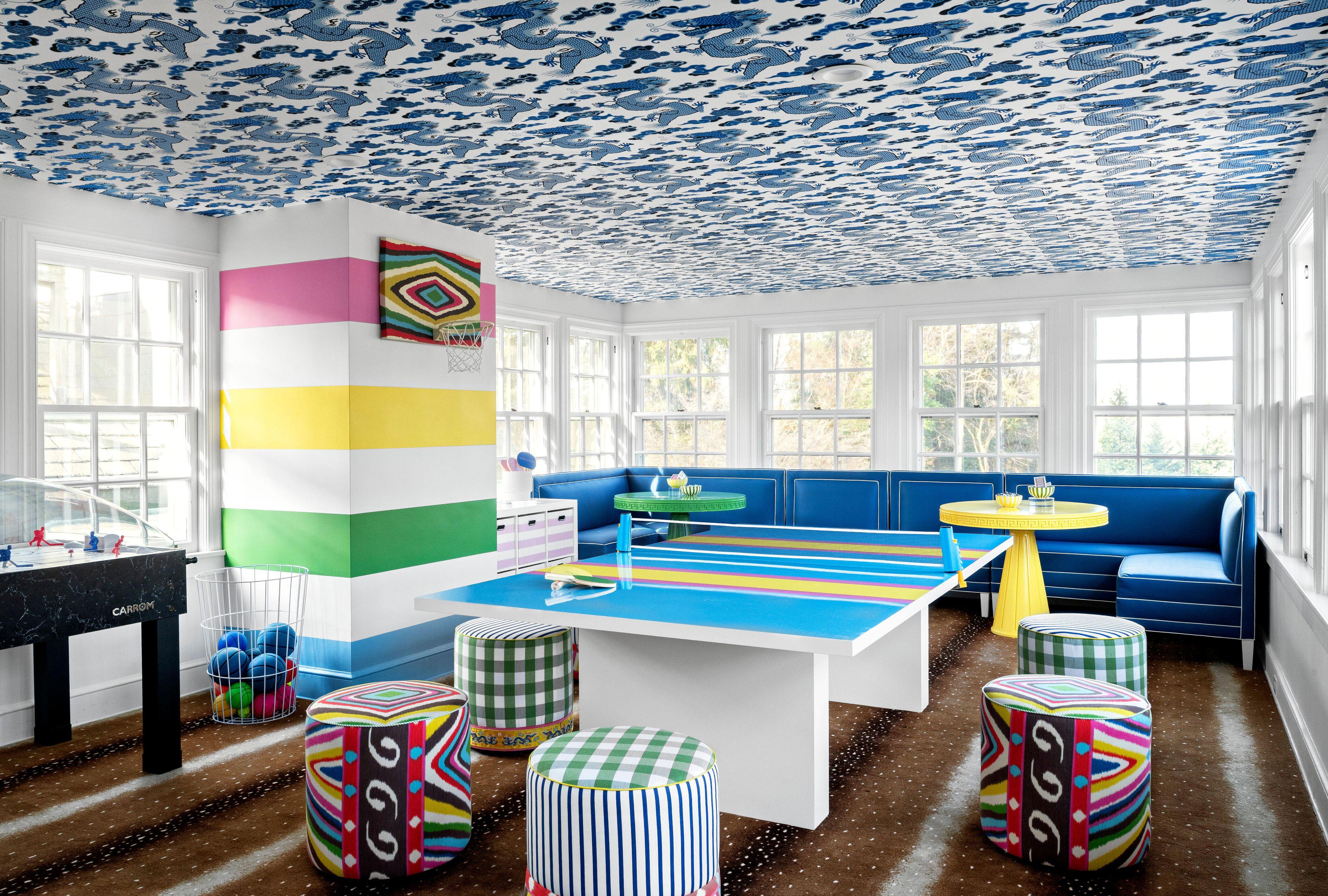 In an age of endless screen time, that’s exactly the point, says designer Megan Gorelick, who created a kaleidoscopic space in Lancaster, PA, centered around a whimsically painted Ping-Pong table. It's actually a custom-painted regulation-size 9' × 5' dining table—perfect for a pizza party once the net comes off. The goal? To lure everyone off their devices and into the moment. Here are four tips for crafting a game room you'll be happy to unplug in.