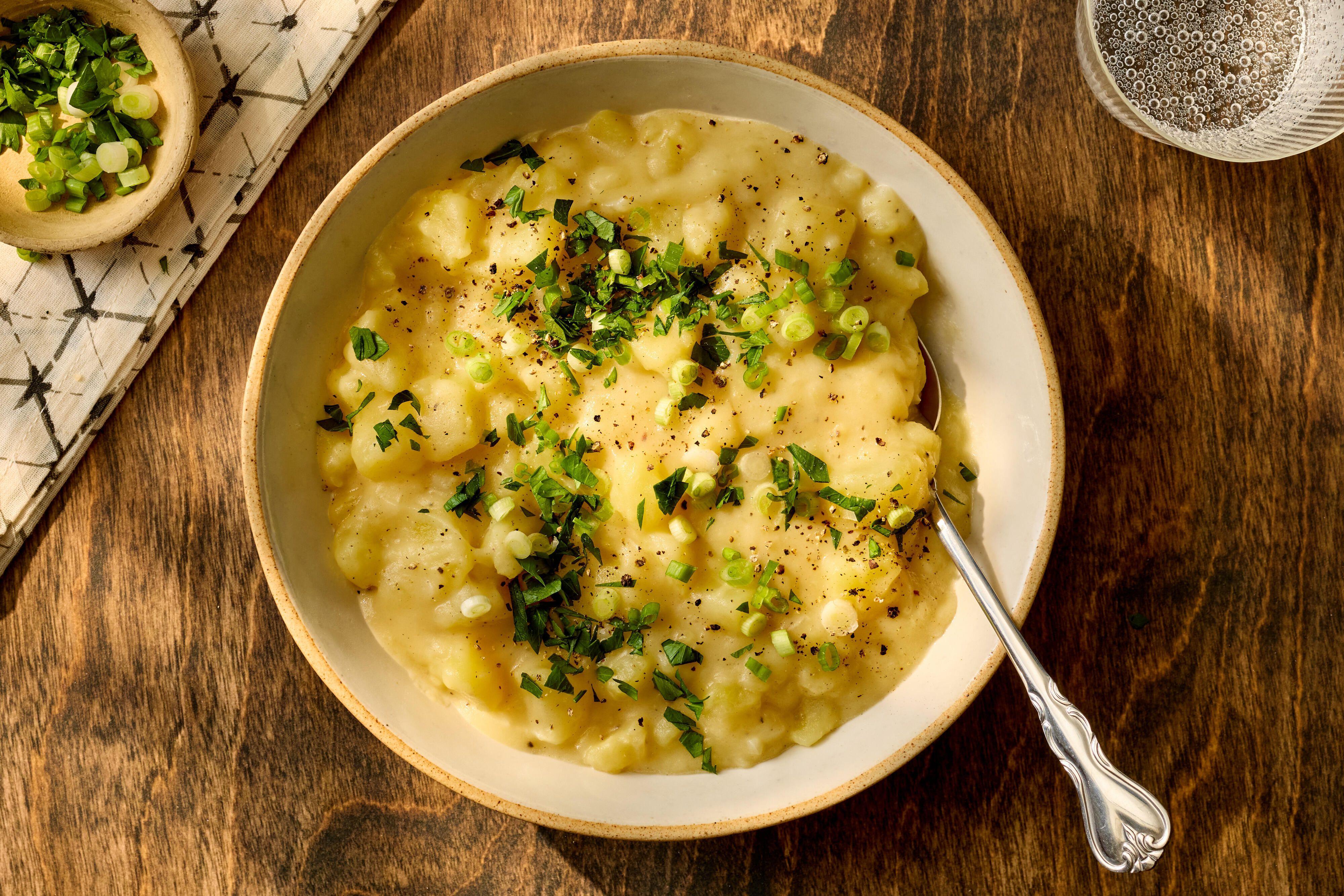 4. Using a slotted spoon, remove 1 cup of the potatoes from the pot. Mash and return to pot.