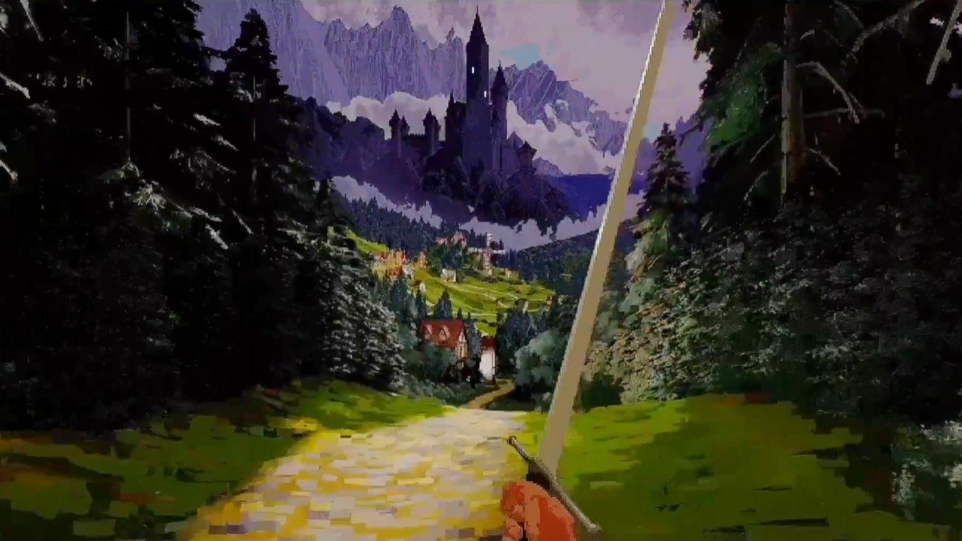 There's also a new, one-minute trailer, which shows the shot from the original Midjourney clip realized into what appears to be an explorable space. The player walks down a similar winding path, with the mountains and a black castle looming in the background. While they no longer hold a torch, they do still carry a sword in one hand. The player then stands on a bridge, spinning around to give a full 360-degree view of the world around them.