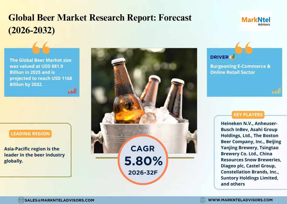 MarkNtel Advisors, a leading market research and consulting firm, has announced the release of its latest study titled Beer Market Research Report: Forecast (2026–2032). This report provides a detailed assessment of the Beer Market, covering its evolving dynamics, emerging trends, key growth drivers, major challenges, and competitive landscape.