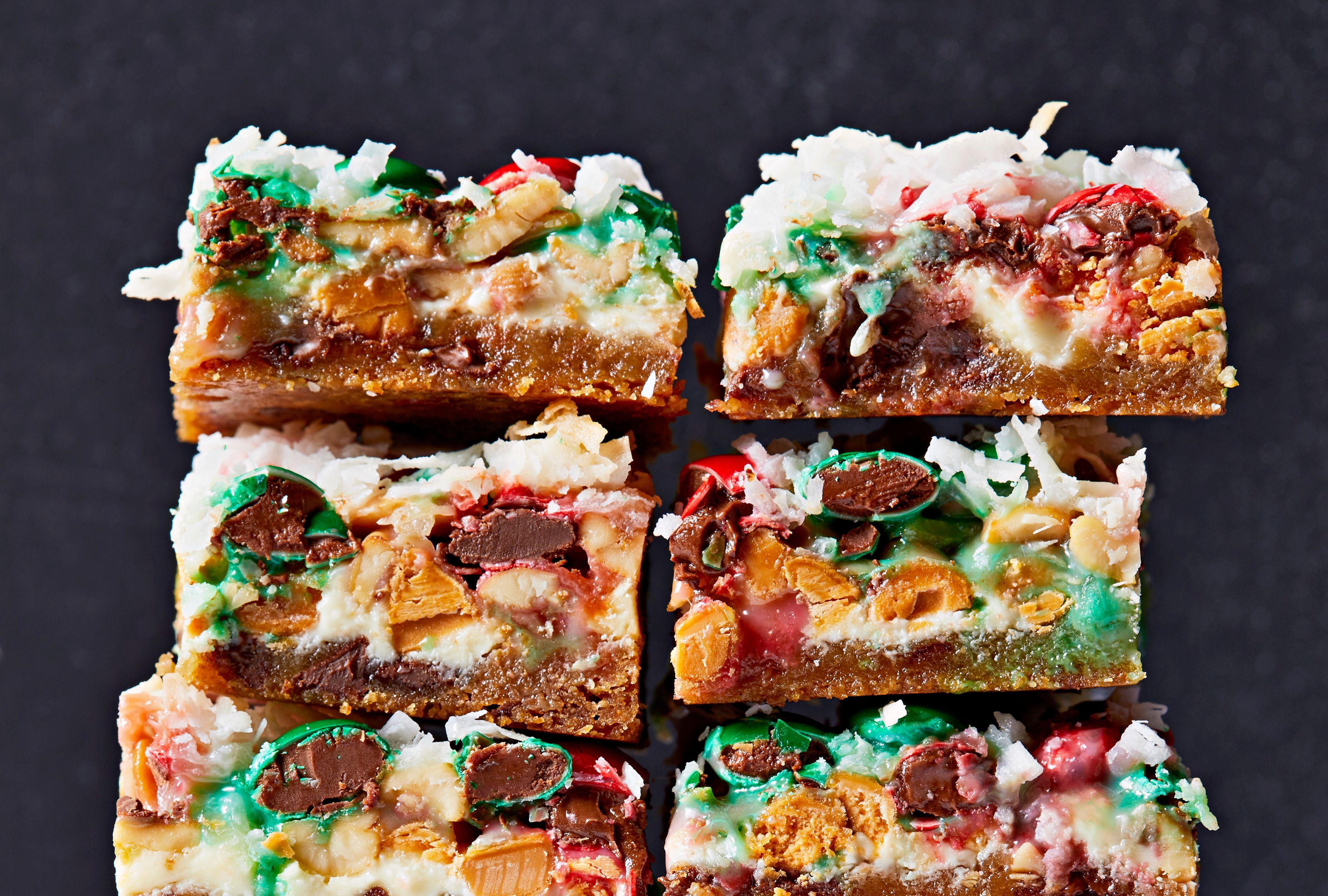"Tis the season for festive spins on our favorite retro recipes, like this remake on gooey seven-layer bars. We went all in with refrigerated cookie dough as the base, and a layer each of white chocolate, butterscotch chips, salted cashews, condensed milk, Christmas-colored M&Ms, and a shower of flaked coconut. You can customized this dessert to your heart's content with different types of nuts, baking chips, candies, and more.