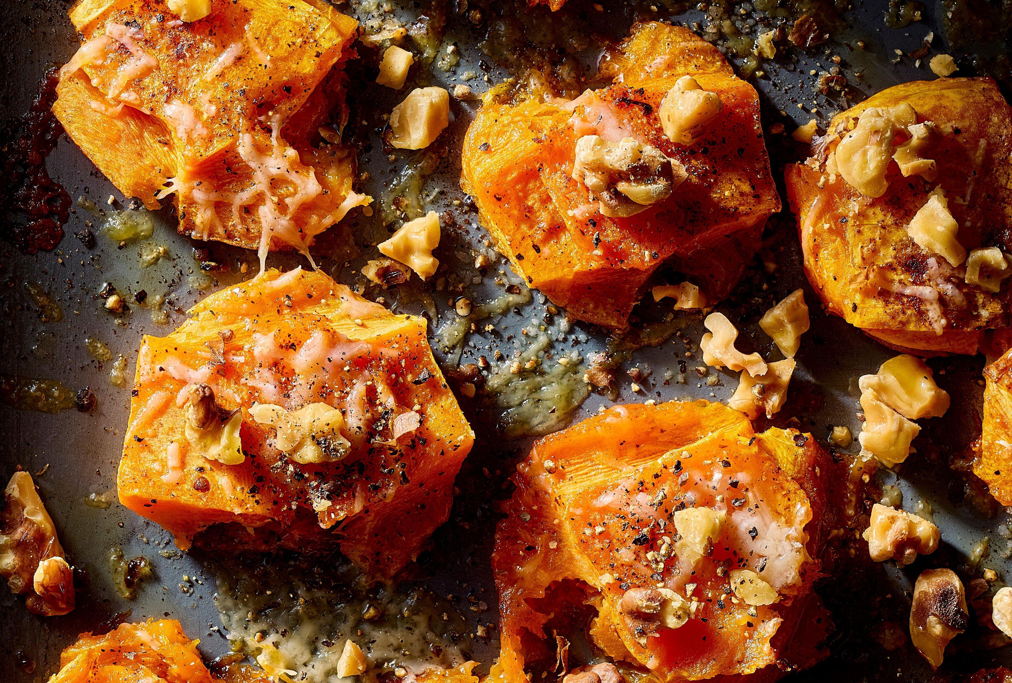 Because it has a similar starchy texture to potatoes, butternut squash lends itself to smashing just as well as the original smashed tater. A glass measuring cup is the perfect utensil to give the squash pieces a gentle but firm press once they are softened from their first roast. The second roasting time crisps up the edges in toasty oil while melting the Asiago cheese on top. The finishing touch is a sprinkle of toasted walnuts for crunch.