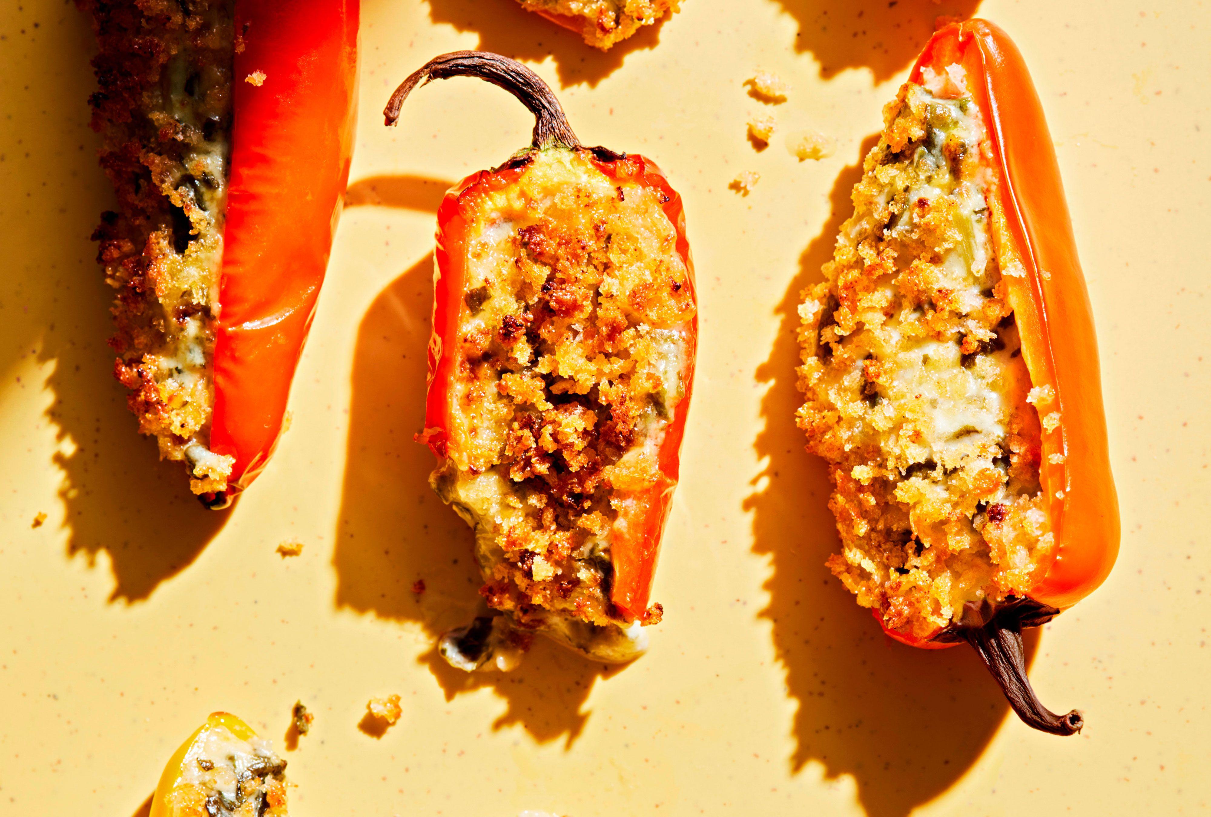 In a small dish combine melted butter and paprika. Add panko; toss to coat. Dip peppers, filling side down, into panko mixture to coat.