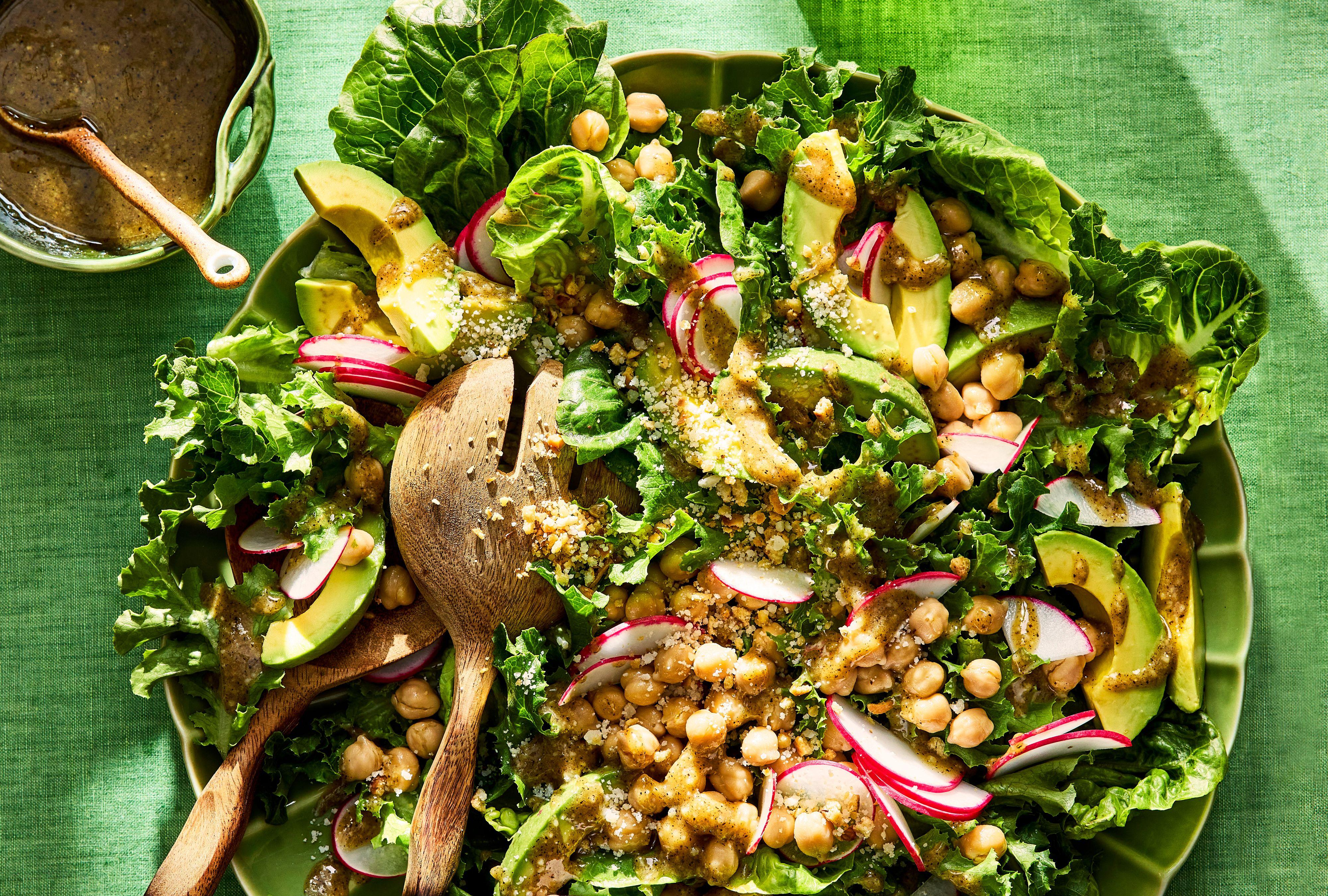 In a large serving bowl, create a bed of greens followed by chickpeas, avocados, and radishes. Sprinkle with pita bread crumbs and drizzle with about 1/2 cup dressing. Add more dressing, if you like, and finish with the remaining 1/4 cup Parm and a couple cracks of black pepper; toss and serve.