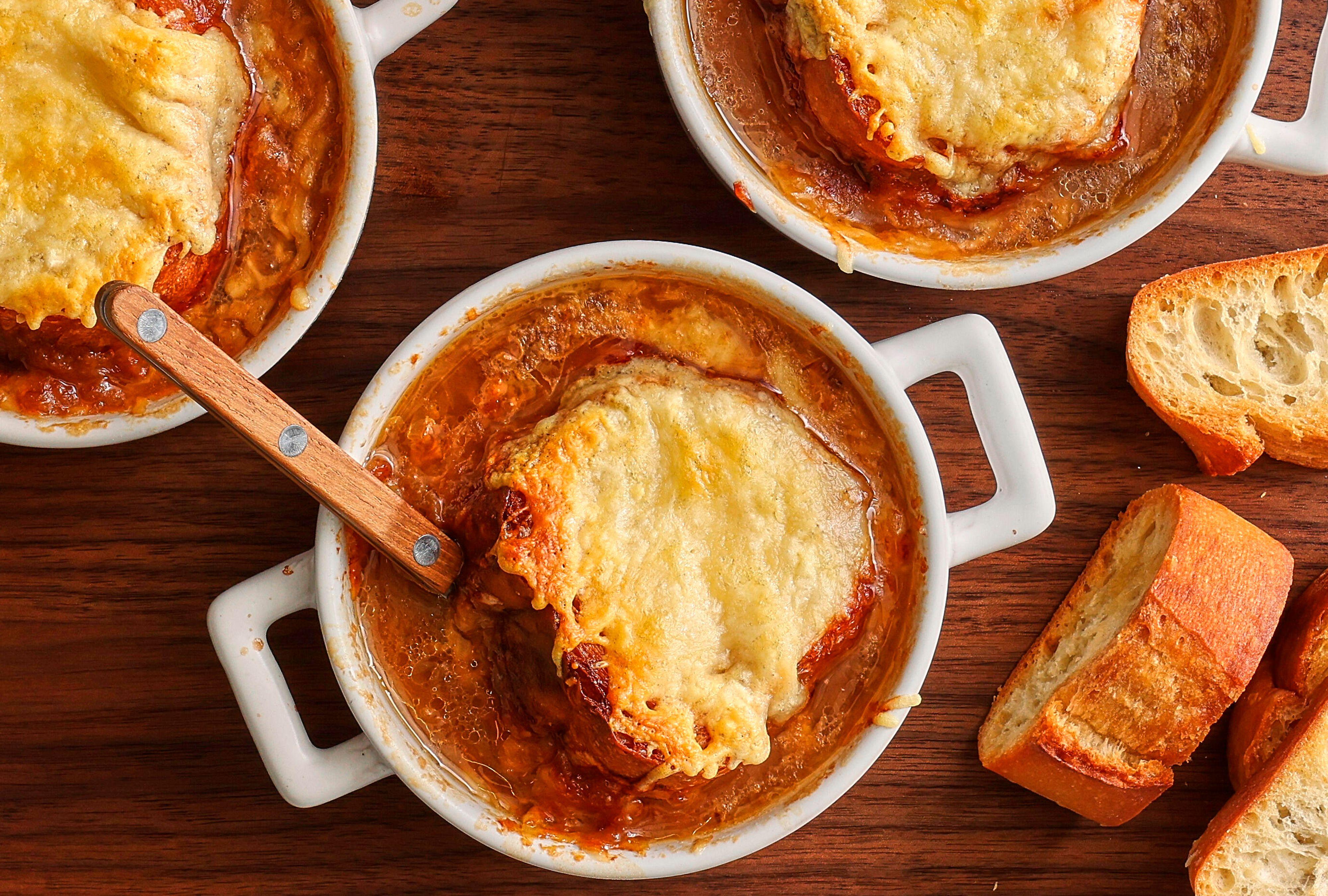 • Don't try to rush the caramelization process. It may seem tedious, but it's the key to developing the deep flavor that this soup is known for. A touch of sugar helps bring out the natural sweetness of the onions.