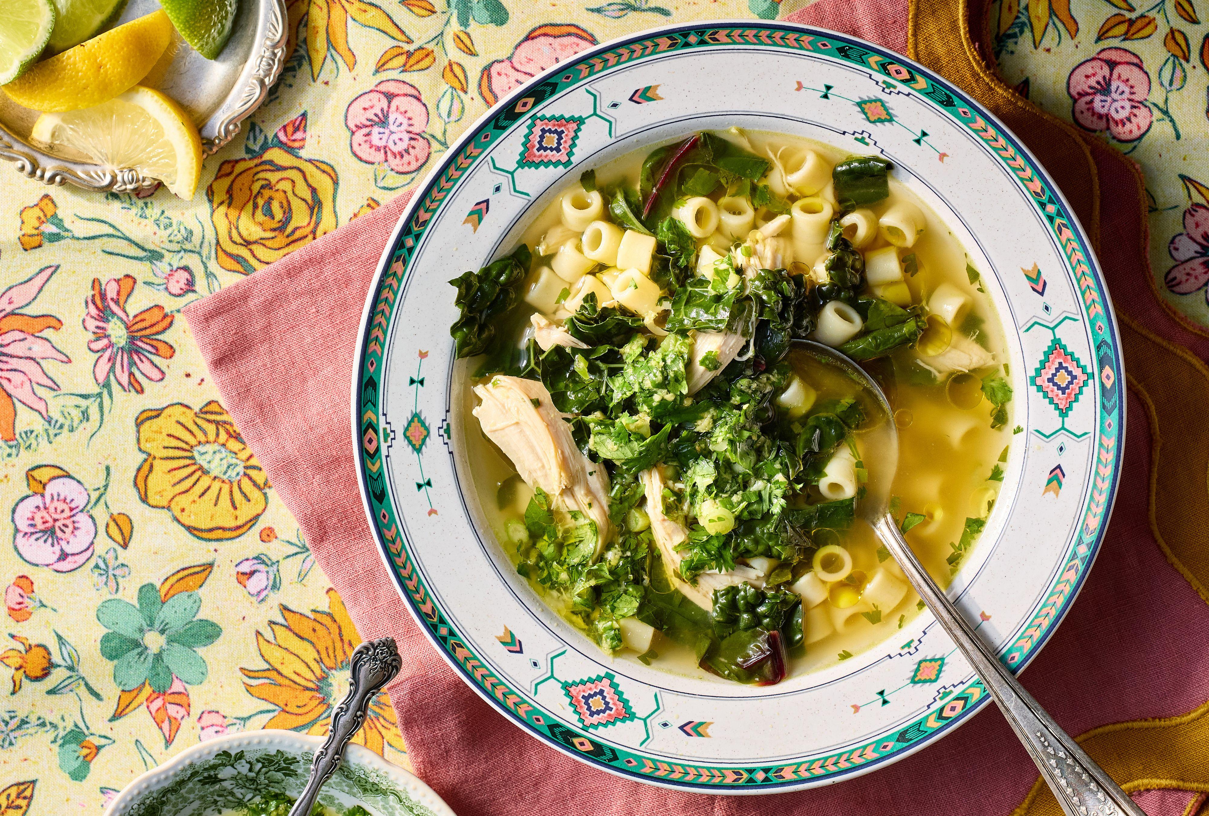 Ginger and Greens Noodle Soup is a hearty, delicious dish packed with pasta, greens, garlic, ginger, and your favorite broth. Featured in Alison Roman's Something from Nothing, hearty greens cook down to a tender, almost-braised texture, while a bright herb-ginger finisher adds a hit of spice and freshness to your bowl. This soup can be made three days ahead and refrigerated. It could also be made, sans noodles, and frozen several months ahead. Whenever you eat it, it's sure to be a hit.