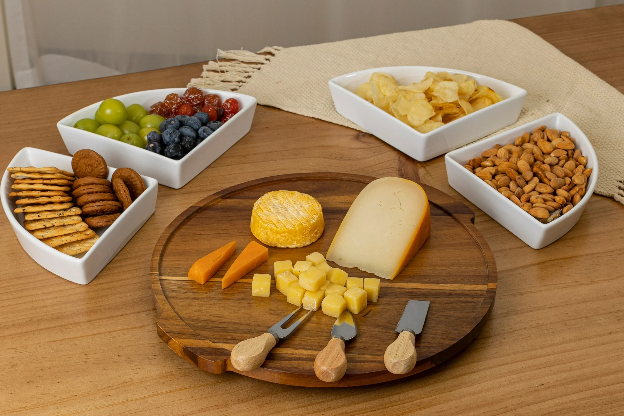 Make your snacks easy to access from anywhere in the living room—even when you’re kicking back on your couch. This acacia and stoneware serving tray comes with four stoneware bowls, ready to hold your favorite chips and dips. The base is made of acacia wood and rotates 360 degrees for snacking. Each dish is fully removable for simplified cleanup.