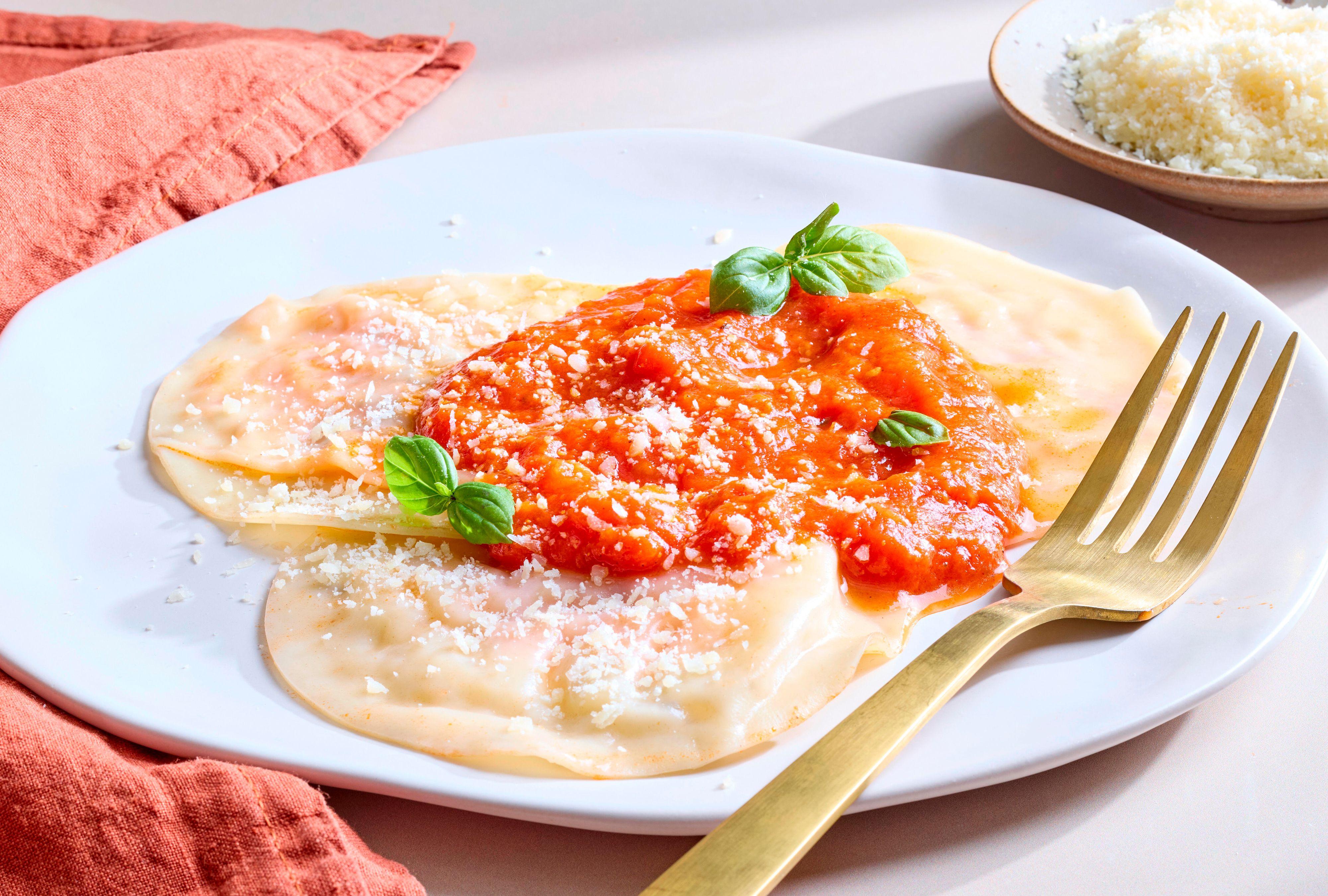5. Serve. Spoon some warm marinara sauce in each plate or bowl, then top with your desired serving size of ravioli. Top with a final scoop of marinara, a few fresh basil leaves, and more Parmesan cheese.