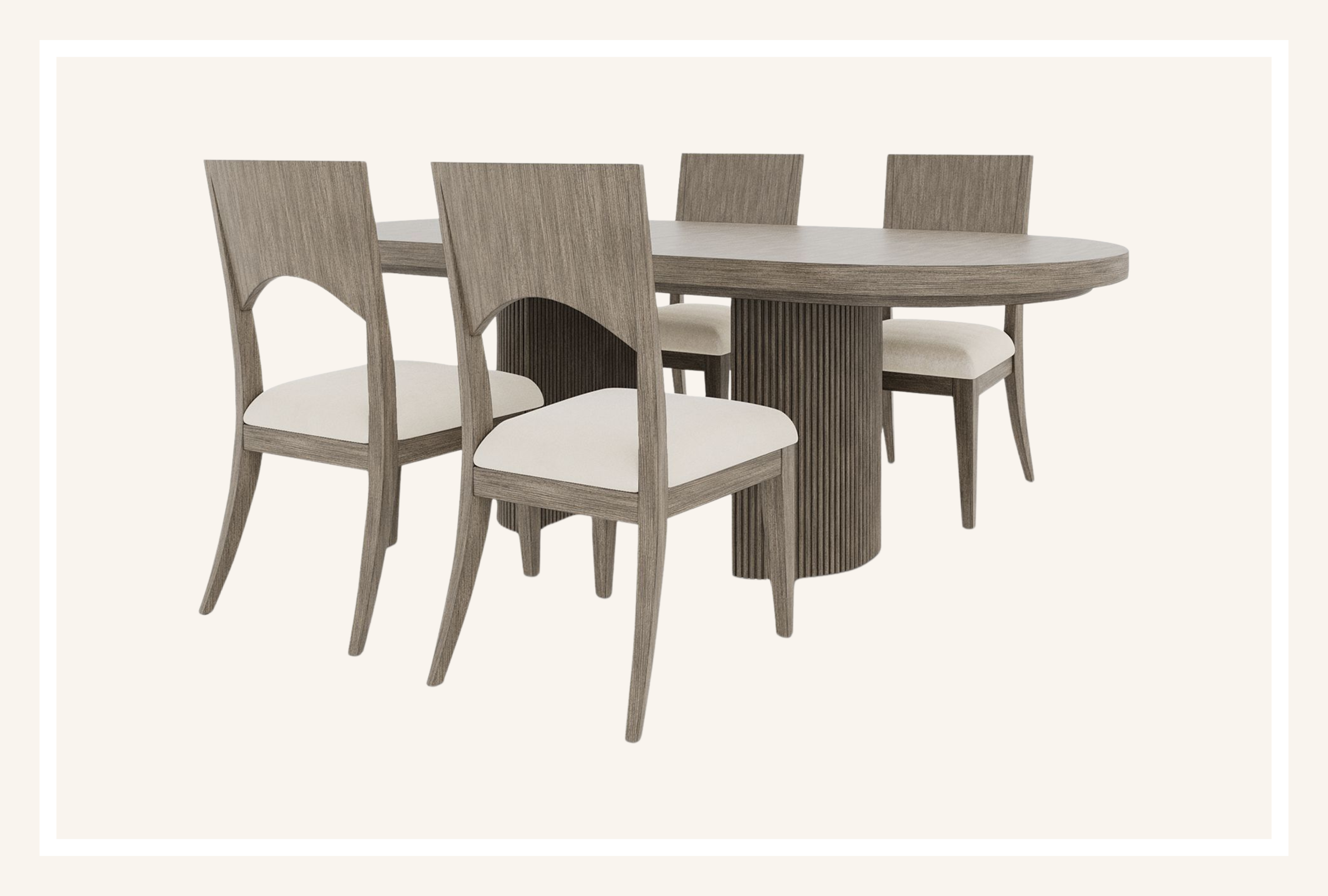 Oval dining tables are a popular way to utilize a large table that doesn’t feel sharp or overwhelming. Inspired by the need for a cozier, more personal gathering space, you won’t ever have to worry about who sits at the head of the table when you choose an oval dining table. Our oval table pick of the moment is from Macy’s Frandlyn collection. We’re obsessed with the silvery brown wood finish on this collection (the set is also available in blonde), and the wood grain detailing and soft gray hue pair beautifully with any dining space