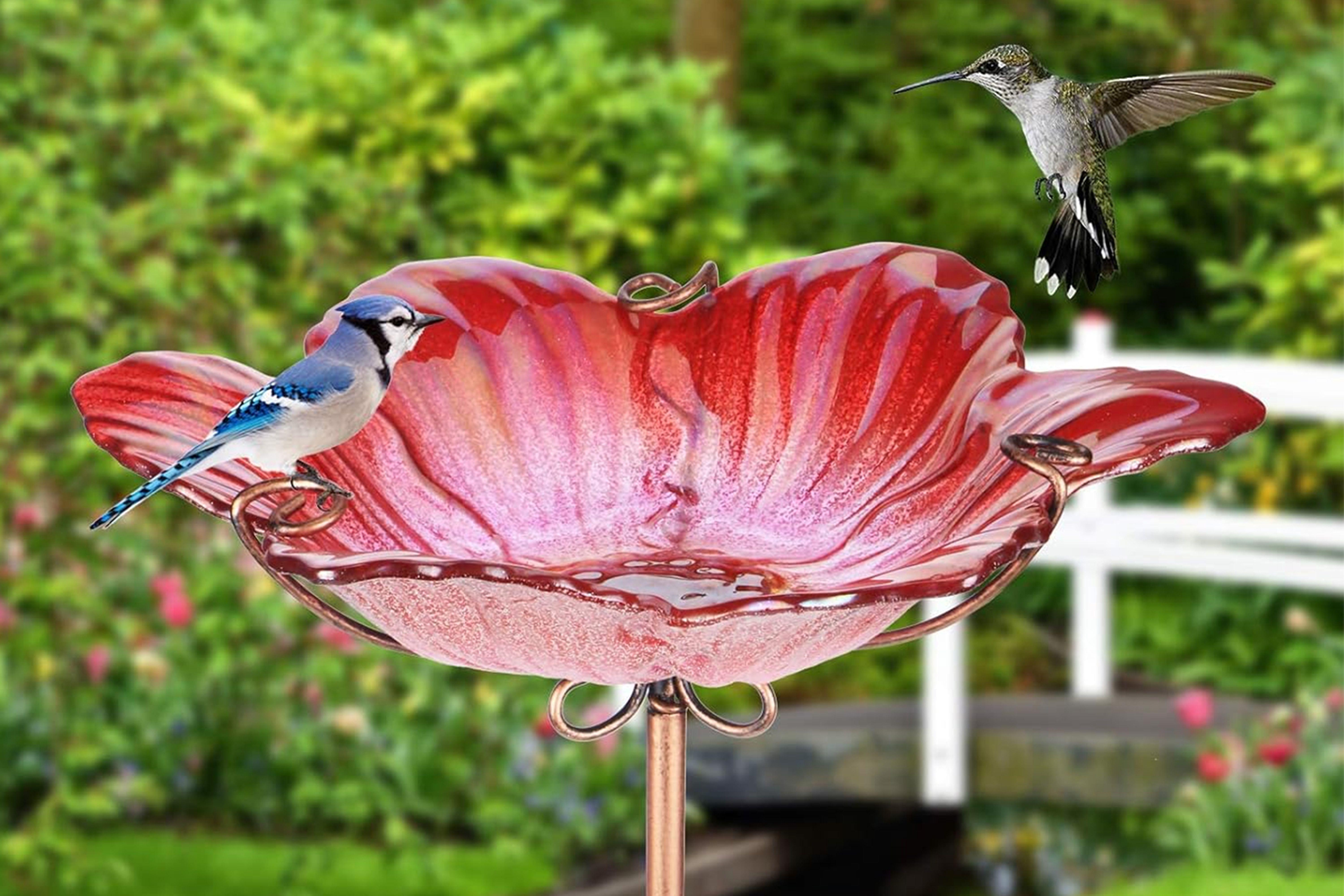 The colorful bath features a shallow glass round bowl that can either hold water for thirsty visitors or be filled with birdseed. The bowl is supported by a classic pedestal base that boasts an antique-bronze finish, and the base is positioned 27 inches off the ground, keeping birds elevated off the ground and less vulnerable to predators. Between the fixture’s weather-resistant materials and decorative style, this bird bath is made to last with additional built-in stakes to secure it in place throughout the seasons.
