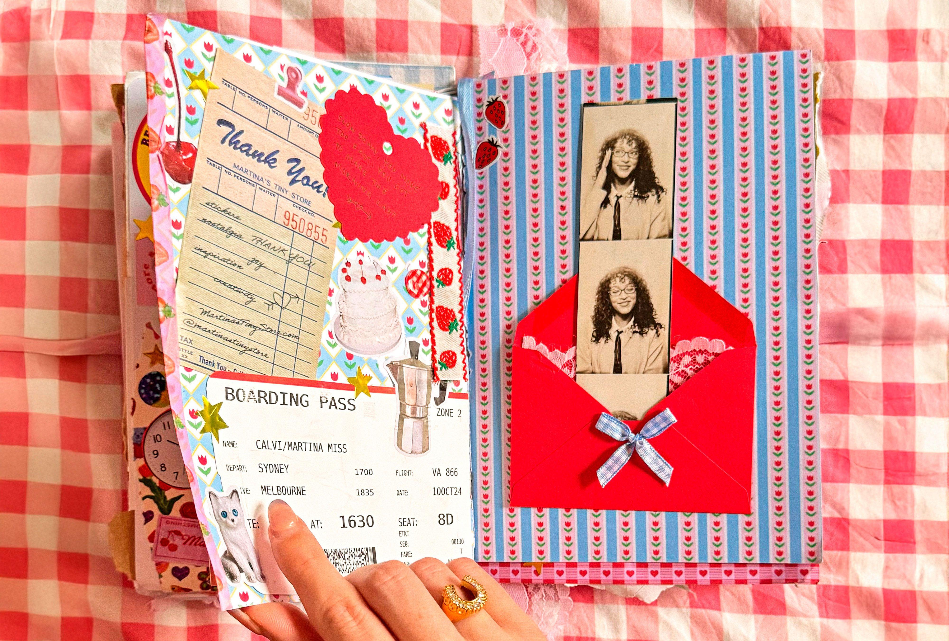 Martina Calvi (@martinamartian) creates art with junk. Things you’d typically put in the trash—receipts, fruit stickers, even sugar packets—are her medium. When arranged in one of her 30+ journals, the detritus becomes a beautiful expression of Calvi’s daily life, often themed around her mood, travels, or a color. “It’s a way to preserve my memories and romanticize the everyday,” she says. “Even the mundane is worth documenting.” Now, she’s teaching others how to do the same in her second book, A Year of Junk Journaling. Here, she shares a few tips to get started.