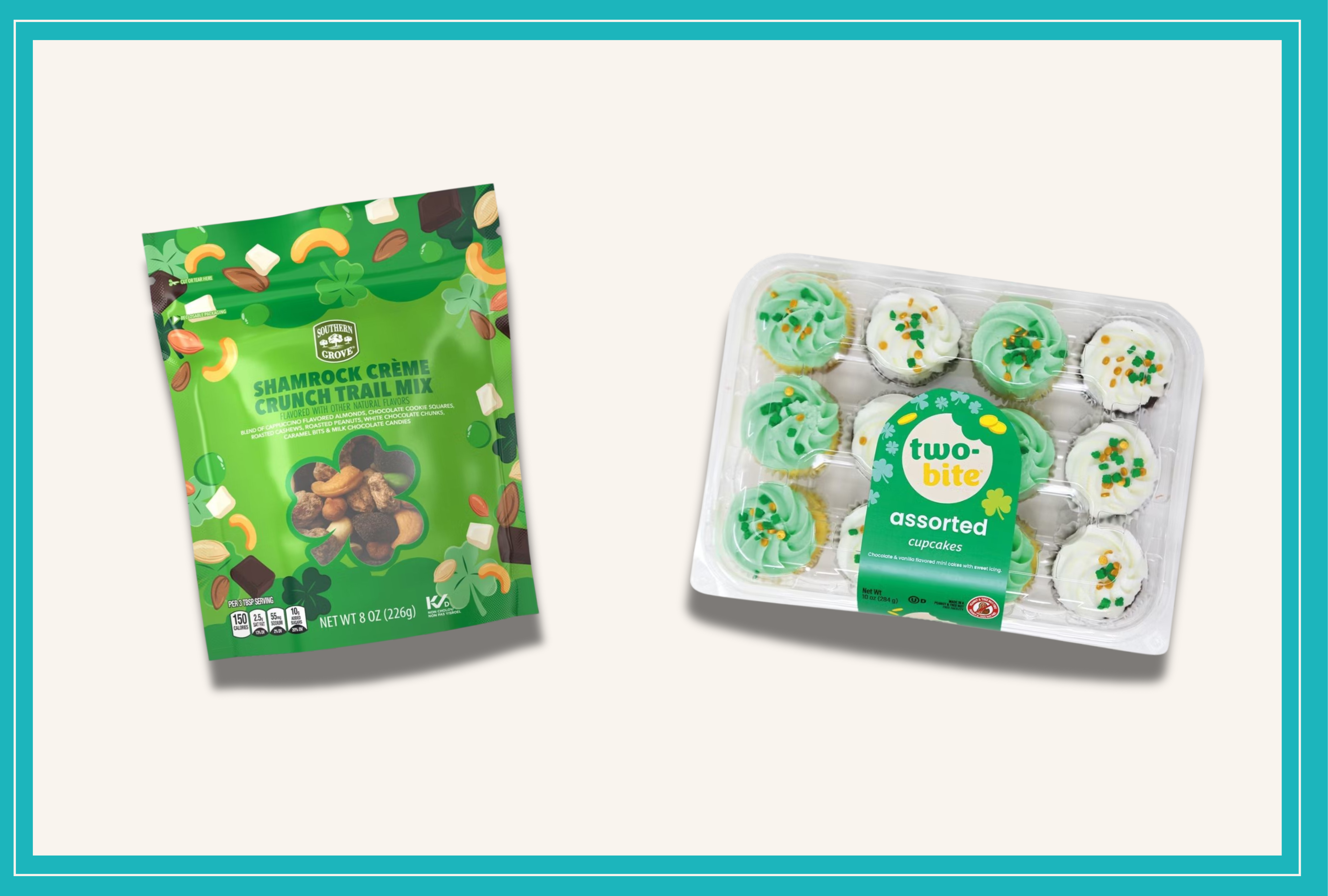 Cupcakes with green and white frosting will spruce up any St. Patrick’s Day spread, and these miniature cupcakes are easy to eat in a couple of bites. One pack of cupcakes contains six vanilla cupcakes and six chocolate cupcakes—each cupcake is topped with St. Patrick’s Day-themed sprinkles. A pack retails for $4.