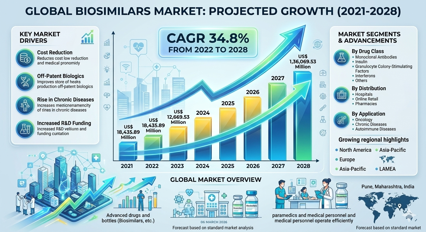 The global Biosimilars Market is experiencing remarkable growth as healthcare systems increasingly adopt cost-effective alternatives to biologic drugs. According to industry research, the biosimilars market size is projected to grow from US$ 18,435.89 million in 2021 to US$ 136,069.53 million by 2028, registering a strong CAGR of 34.8% during 2022–2028. The rising burden of chronic diseases and the increasing need for affordable treatment options are key factors supporting this rapid market expansion. Pharmaceutical companies are investing heavily in biosimilar drug development to address the growing demand for biologic therapies at lower costs.