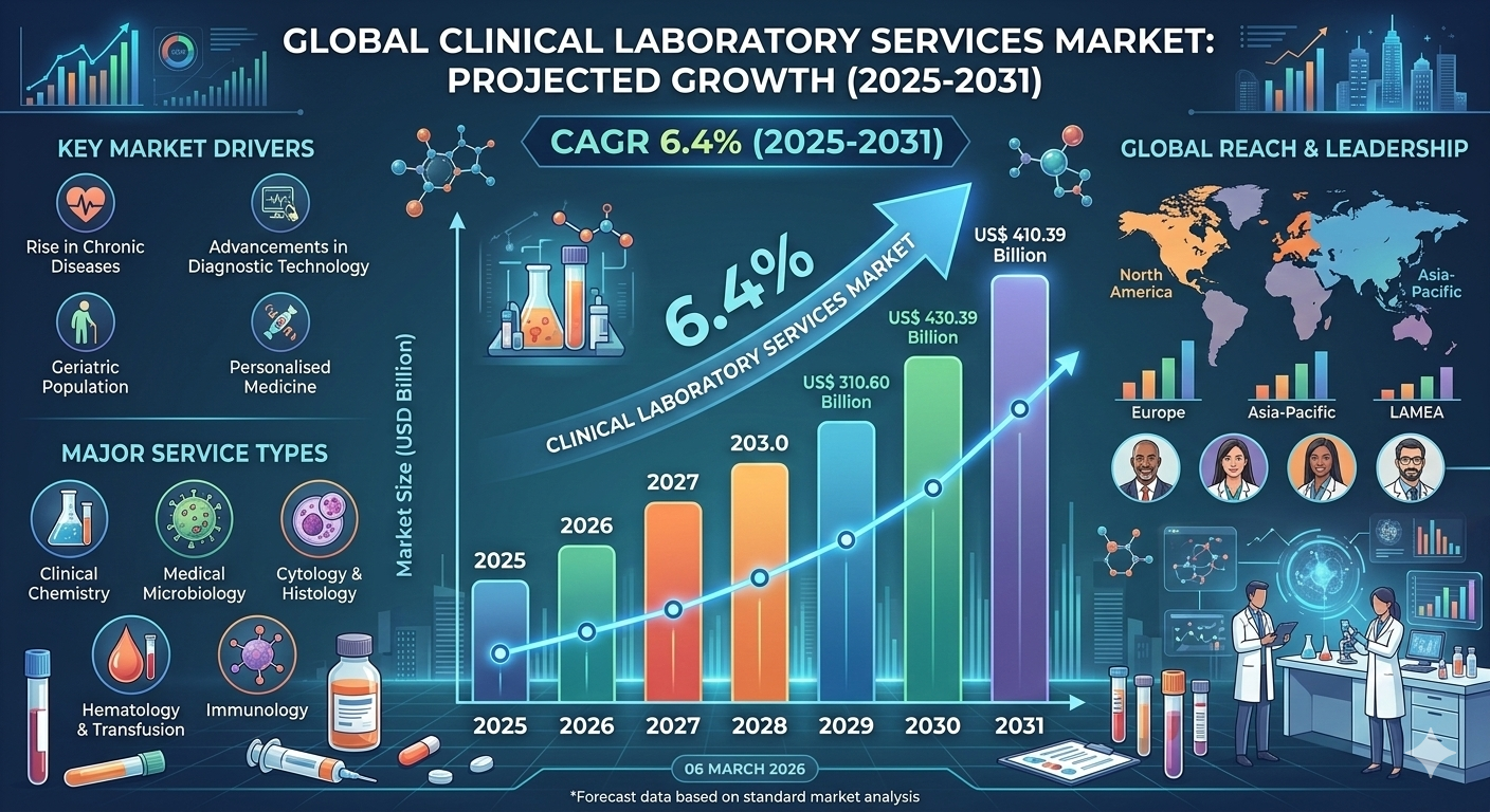 The global Clinical Laboratory Services Market is experiencing strong growth as the demand for diagnostic testing continues to rise across healthcare systems worldwide. According to industry analysis, the market size is expected to reach US$ 410.39 billion by 2031, registering a CAGR of 6.4% during 2025–2031. Clinical laboratory services play a crucial role in modern healthcare by providing accurate diagnostic data that helps physicians detect diseases, monitor patient health, and determine effective treatment strategies. With increasing prevalence of chronic diseases, growing healthcare awareness, and advancements in diagnostic technologies, the market is expected to expand significantly over the coming years.