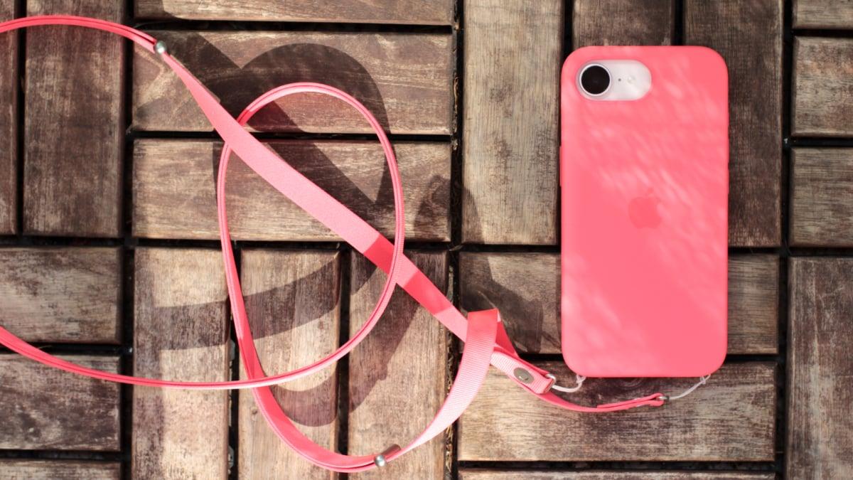 The iPhone 17e Silicone Case (this one is in the Bright Guava color) can be attached to Apple's Crossbody Strap. Credit: Stan Schroeder/Mashable