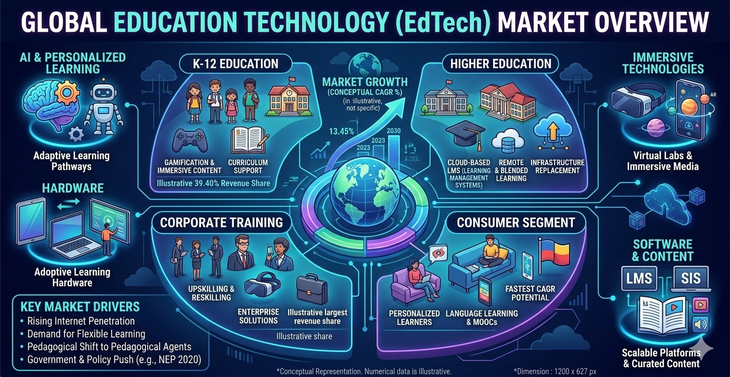 Education technology encompasses a wide range of tools and platforms designed to facilitate learning and improve educational outcomes. This includes online learning platforms, learning management systems (LMS), mobile applications, virtual classrooms, and educational software. The global EdTech market is expected to witness substantial growth as educational institutions and corporate training programs adopt innovative technologies to meet the evolving needs of learners.