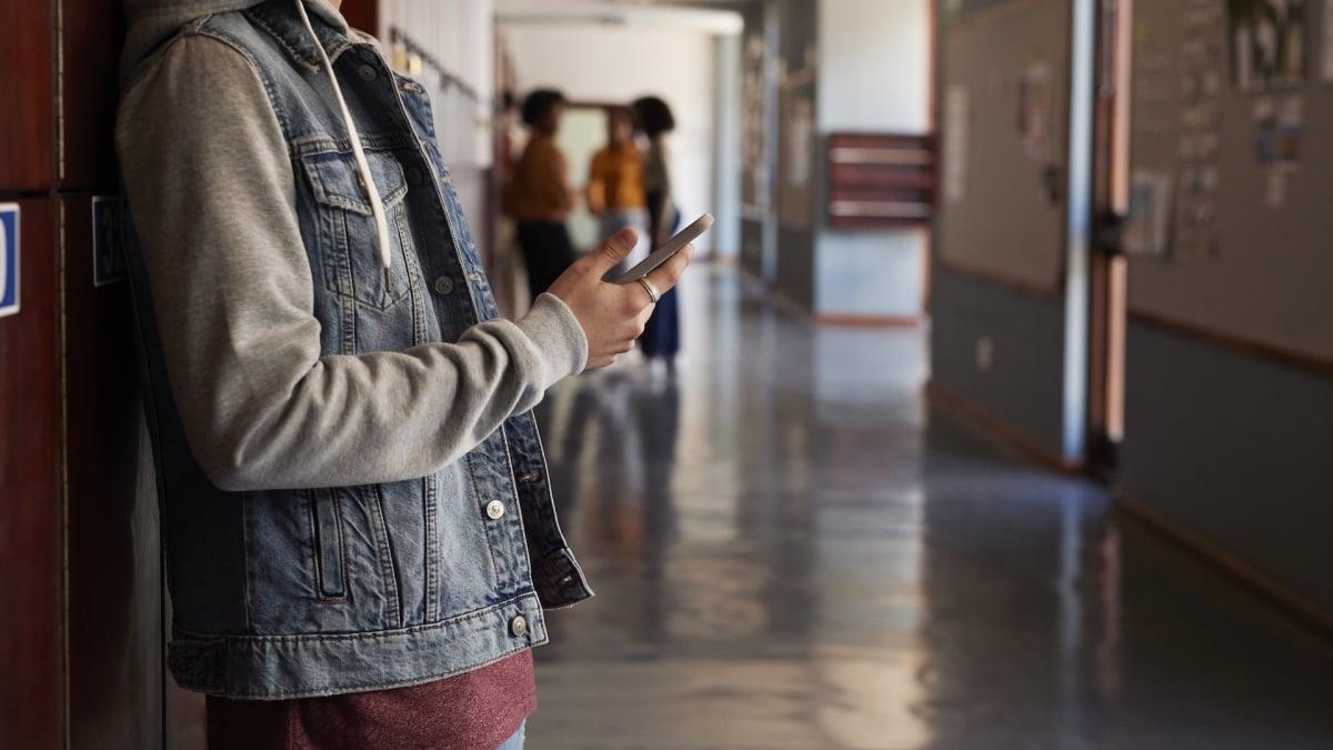 Teen boy stands in school hallway holding phone in his hand.
