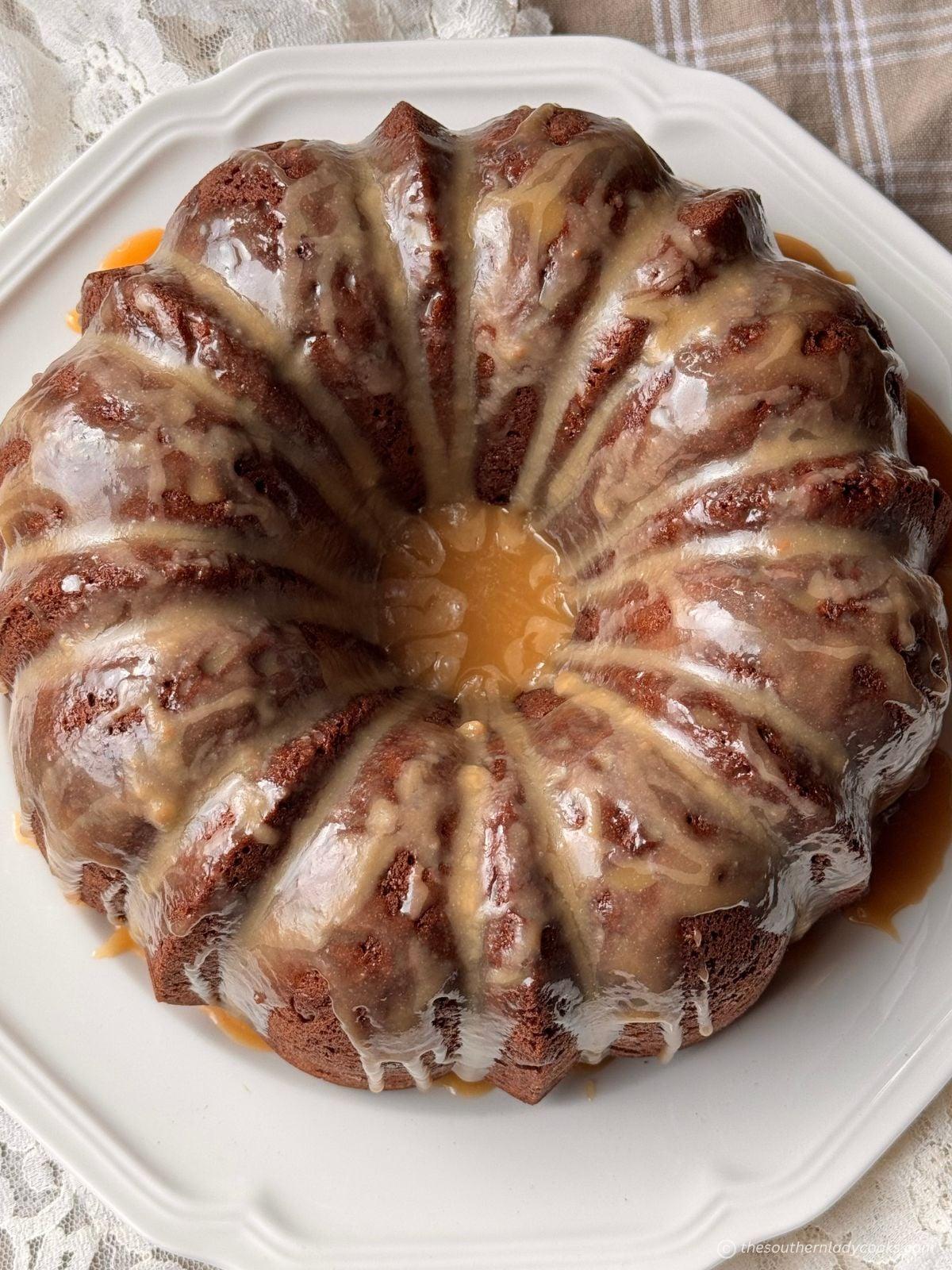 Devils Food Cake with Chocolate Chips and Caramel Frosting made in a bundt pan