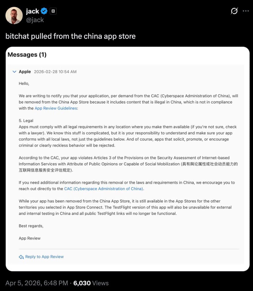 YUBNUB.NEWSApple Removes Bitchat from China App Store at Cyberspace Administration OrderApple deleted Bitchat from the China App Store, acting on a direct order from the Cyberspace Administration of China. Jack Dorsey, who created the app, posted a screenshot of Apples removal notice0 Comments 0 Shares 1 Views -